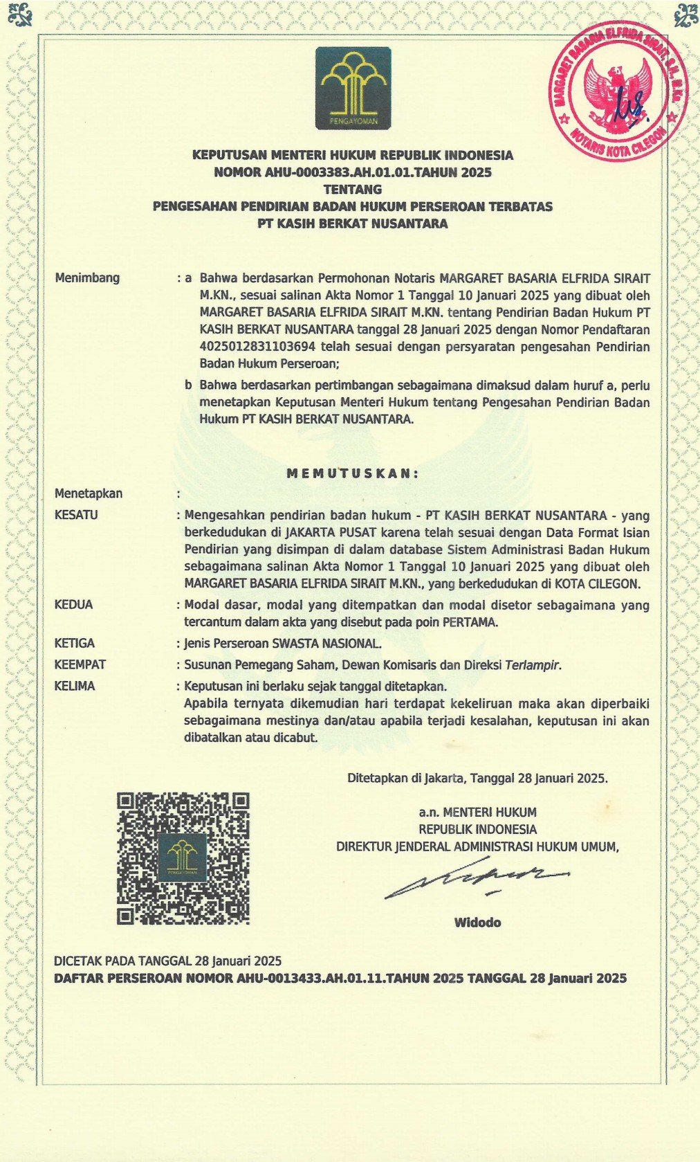 Keputusan Menteri Hukum Nomor AHU-0003383.ah.01.01 Tahun 2025 tentang Pengesahan Pendirian Badan Hukum Perseroan terbatas PT Kasih Berkat Nusantara